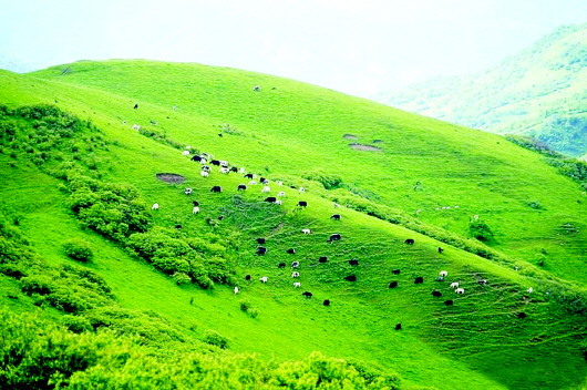 秦人遠(yuǎn)去了,只留下那些讓后人至今懷想不已的地名,諸如石鼓山、景墩梁、牧馬梁、上店子、下店子、大卜峪、瓦泉峪等,而尤以石鼓山最為著名,著名得連那部白發(fā)三千丈的《水經(jīng)注》里,都記載著它的故事:“山在梧中聚,有石鼓不擊自鳴,鳴則兵起。漢成帝鴻嘉三年,天水冀南山有大石自鳴,聲隱隱如雷,有頃止,聞于平襄二百四十里,野雞皆鳴。石長丈三尺,廣厚略等,在崖勒,去地百余丈,民俗名曰石鼓。”石鼓山是朱圉山最高峰,海拔2625米,山峰陡峭,人跡罕至,遠(yuǎn)望如石鼓,近看似臥牛,茂林幽泉,森秀無比。初春時節(jié),萬物透綠而石鼓白雪皚皚;大雨前夕,飛鳥翱翔而山上煙云彌漫。更為神奇的是,山丘之巔,突兀一石,酷似一頭臥北朝南的耕牛,翹首做犀牛望月之狀,人稱臥牛山。臥牛山石頸之下,有一巨石,其面圓而平,每當(dāng)正午陽光直射之時,遠(yuǎn)遠(yuǎn)望去,石面宛如獸皮所蒙,恰如一面威風(fēng)凜凜的巨型戰(zhàn)鼓,恍惚之中,有如雷聲隱隱而來,民呼之曰石鼓,石鼓山因此得名。石鼓山素來以厚重的人文歷史和優(yōu)美的草原風(fēng)光而著稱,尤為聞名的“石鼓擎雪”,自古就是“甘谷八景”之一。千百年來,石鼓山甘愿舍棄繁華,遠(yuǎn)離人世,在淡泊寧靜的歲月中,固執(zhí)而堅定地守望古坡,守望古坡人家。