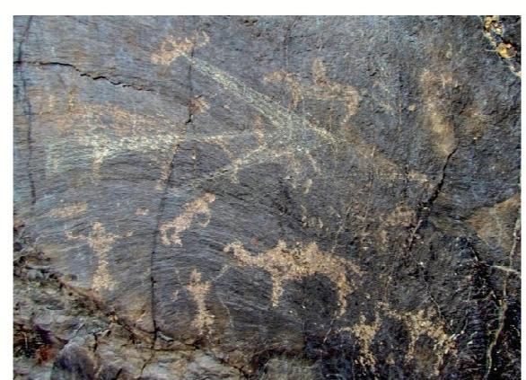 黑山巖畫全稱為“黑山摩崖淺石刻巖畫”,分布于嘉峪關(guān)西北約 10—20公里處的黑山峽谷陡崖峭壁上,為遠(yuǎn)古時期黑山地區(qū)游牧民族生產(chǎn)、生活的真實記錄?,F(xiàn)共發(fā)現(xiàn)分布在黑山石關(guān)峽口、磨子溝、蕉蒿溝、四道股形溝、紅柳溝、交河溝六處戰(zhàn)國至明代時期的巖畫,共 157 幅。黑山巖畫反映的時限跨度大,時空關(guān)系復(fù)雜,涉及部族較多。畫面所反映的內(nèi)容豐富多彩,有動物、人物、佛塔、植物等,還有大型的操練舞蹈場景。涉及人類學(xué)、社會學(xué)、歷史學(xué)、考古學(xué)、美術(shù)學(xué)、生物學(xué)、地理學(xué)等多個學(xué)科,具有較高的研究價值。