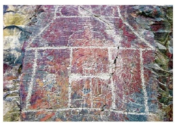 黑山巖畫中的晚期巖畫,主要反映宗教文化。紅柳溝、石關(guān)峽口巖畫中的殿堂、佛塔、佛像、古藏文題刻,可能屬于唐代中期以后的宗教遺物。藏傳佛教在 7世紀(jì)時同古藏文一起為吐蕃松贊干布創(chuàng)立。據(jù)史書記載,唐因平定“安史之亂”,河西空虛,吐蕃乘機(jī)占領(lǐng)河隴之地達(dá) 100 余年。吐蕃人居住河西,在紅柳溝、石關(guān)峽刻畫佛教殿堂、菩薩、佛像、佛塔是完全可能的。由此推斷,黑山紅柳溝、石關(guān)峽口佛塔、佛像及藏文題刻為唐中期以后的吐蕃所留。
