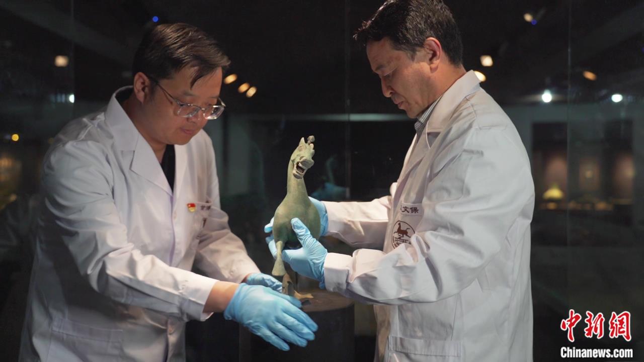 甘肅省博物館文物保護修復(fù)中心主任、副研究館員張東(左)與同事在工作中。受訪者 供圖