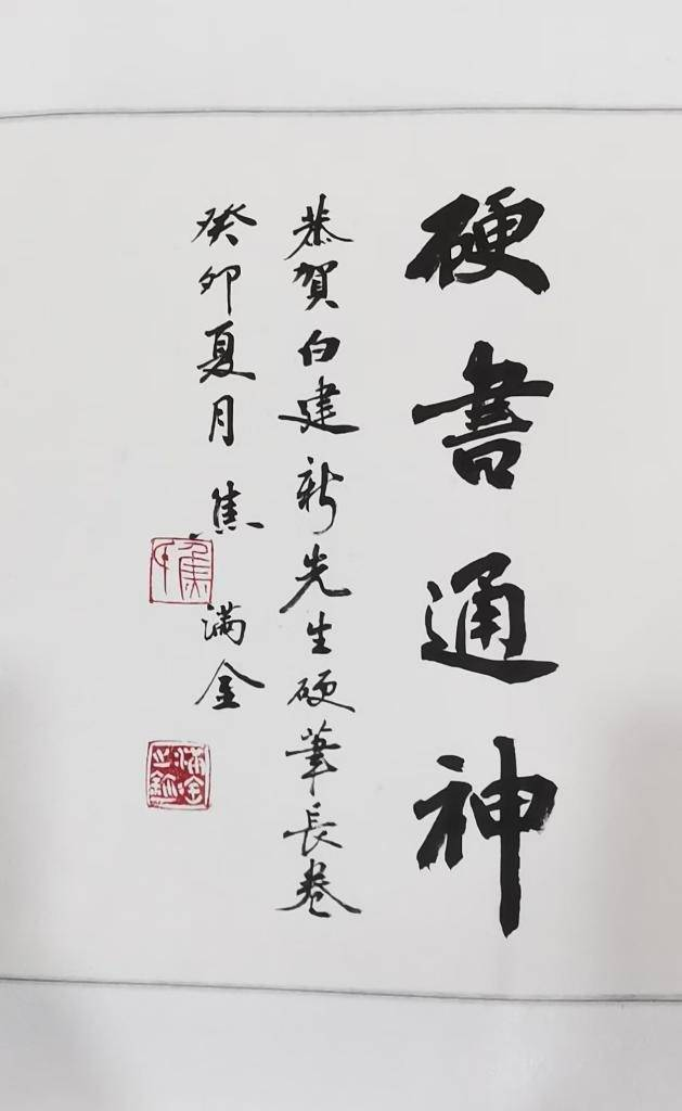 甘肅省硬筆書法家協(xié)會(huì)主席焦?jié)M金先生為該長(zhǎng)卷題詞:硬書通神