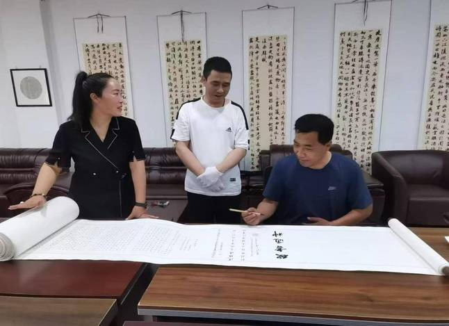 甘肅省硬筆書法家協(xié)會(huì)主席焦?jié)M金(右一)為長(zhǎng)卷題詞