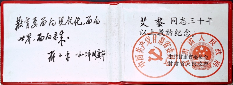 這是一本從教滿三十年的榮譽(yù)證書。由中共甘肅省委、甘肅省人民政府頒發(fā)。證書內(nèi)頁的左側(cè)是鄧小平1983年國慶節(jié)題寫的“教育要面向現(xiàn)代化,面向世界,面向未來”。右側(cè)是“艾黎同志三十年以上教齡紀(jì)念”。“三個面向”是為北京景山學(xué)校的題詞,是鄧小平提出的教育發(fā)展改革方針,旨在推動中國的教育現(xiàn)代化進(jìn)程,使其更加開放和適應(yīng)未來發(fā)展的需要,面向世界,吸收國際先進(jìn)的教育理念和經(jīng)驗;同時展望未來,培養(yǎng)適應(yīng)未來社會需要的人才。