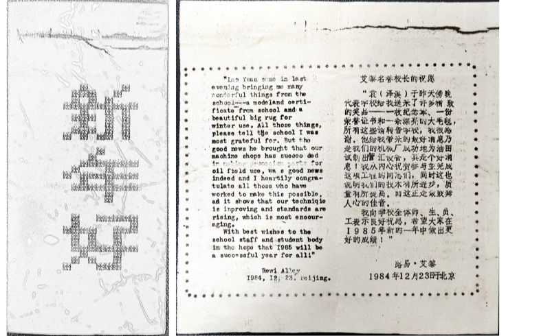 證書是由石油工業(yè)部培黎石油技校申報的。1984年12月30日,培黎石油技校自制的新年賀卡內(nèi)頁用中英文印上了名譽(yù)校長艾黎的祝愿: