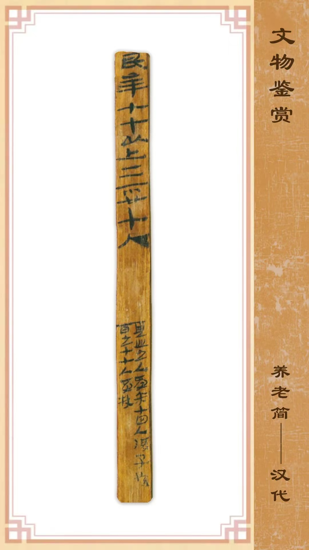 1990年出土于甘肅省敦煌懸泉置遺址,長(zhǎng)22.8厘米,寬1厘米,紅柳材質(zhì)。該簡(jiǎn)記載分類統(tǒng)計(jì)高年老人享受的待遇,是西漢后期養(yǎng)老制度的反映。