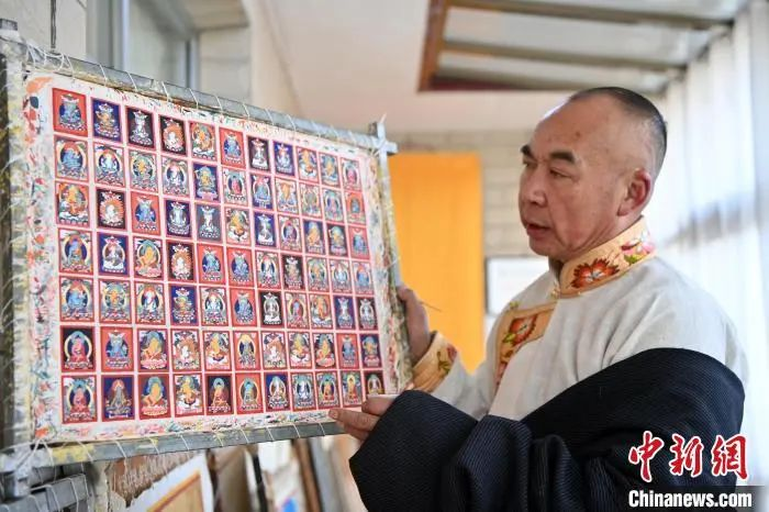 2024年2月2日,甘肅夏河,甘南藏族唐卡國家級(jí)代表性傳承人交巴加布在家中展示其繪制的唐卡。(資料圖)九美旦增 攝