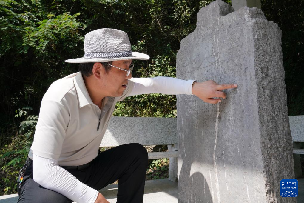 7月14日,在青泥嶺上,徽縣博物館文博副研究館員曹鵬雁在介紹一塊刻有“遠通吳楚”字樣的清代石碑。新華社記者 馬寧 攝