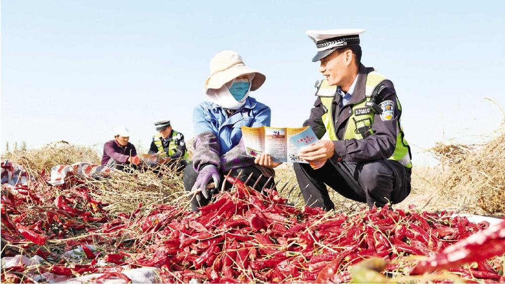 民警在田間地頭向群眾講解交通安全知識。近日,高臺縣公安局交通管理大隊(duì)駱駝城交警中隊(duì)民輔警通過發(fā)放宣傳資料、以案釋法、與村民面對面交流等方式,宣傳道路交通安全法律法規(guī),維護(hù)好豐收季節(jié)農(nóng)村道路交通秩序。新甘肅·甘肅法治報(bào)通訊員 蔣雯麗 攝
