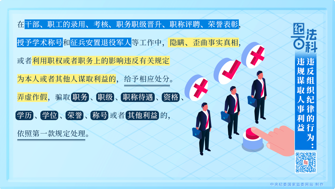 第一款規(guī)定,在干部、職工的錄用、考核、職務(wù)職級(jí)晉升、職稱(chēng)評(píng)聘、榮譽(yù)表彰,授予學(xué)術(shù)稱(chēng)號(hào)和征兵安置退役軍人等工作中,隱瞞、歪曲事實(shí)真相,或者利用職權(quán)或者職務(wù)上的影響違反有關(guān)規(guī)定為本人或者其他人謀取利益的,給予相應(yīng)處分。