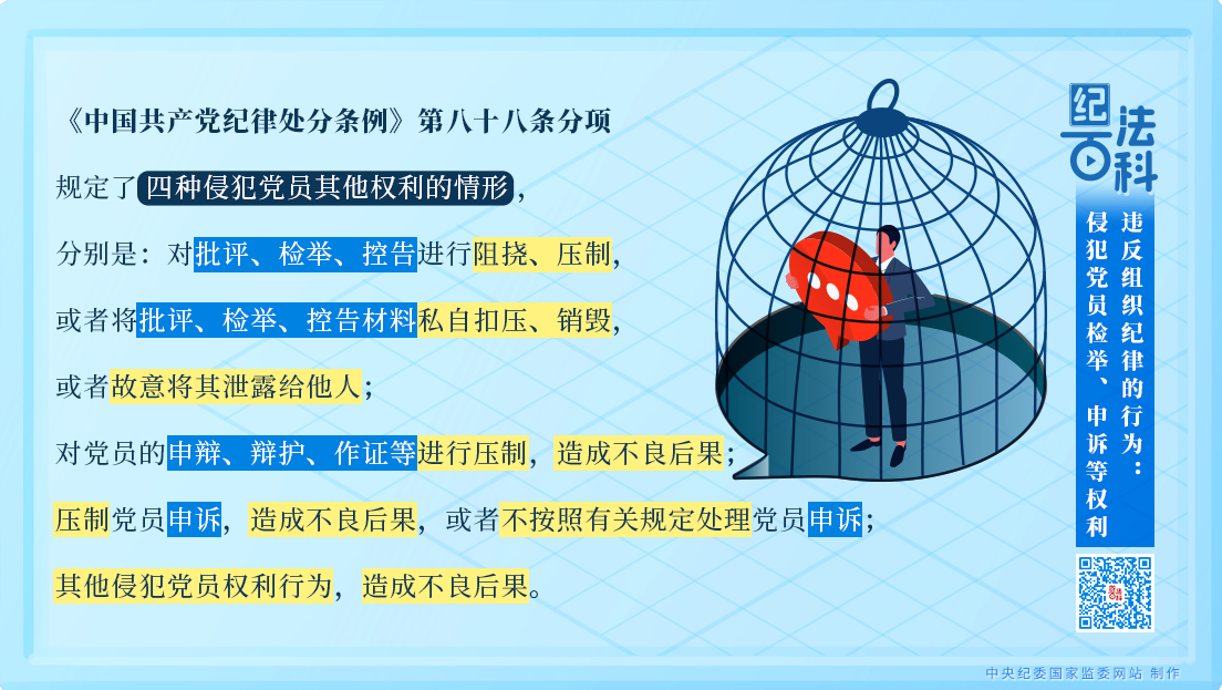 《中國共產(chǎn)黨紀(jì)律處分條例》第八十八條分項(xiàng)規(guī)定了四種侵犯黨員其他權(quán)利的情形,分別是:對(duì)批評(píng)、檢舉、控告進(jìn)行阻撓、壓制,或者將批評(píng)、檢舉、控告材料私自扣壓、銷毀,或者故意將其泄露給他人;對(duì)黨員的申辯、辯護(hù)、作證等進(jìn)行壓制,造成不良后果;壓制黨員申訴,造成不良后果,或者不按照有關(guān)規(guī)定處理黨員申訴;其他侵犯黨員權(quán)利行為,造成不良后果。