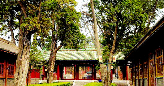 一進(jìn)中院,豁然開(kāi)闊。粗大的柏樹(shù)直沖天際,柏枝濃密,遮天蔽日。這些側(cè)柏樹(shù)干皴裂,似歷盡滄桑,而挺拔之勢(shì),猶如飛龍?jiān)谔?。伏羲廟的柏樹(shù)按照六十四卦方位排列種植,歷經(jīng)千年風(fēng)雨,仍有近半存活,枝繁葉茂,生生不息。先天殿就掩映在這些生長(zhǎng)了幾百年,乃至上千年的古樹(shù)中。