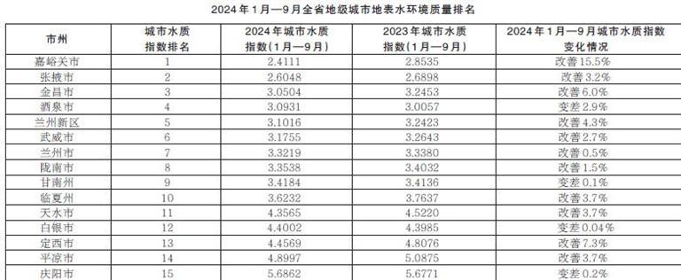 省生態(tài)環(huán)境廳發(fā)布2024年1月—9月全省14個(gè)地級城市及蘭州新區(qū)地表水環(huán)境質(zhì)量排名情況