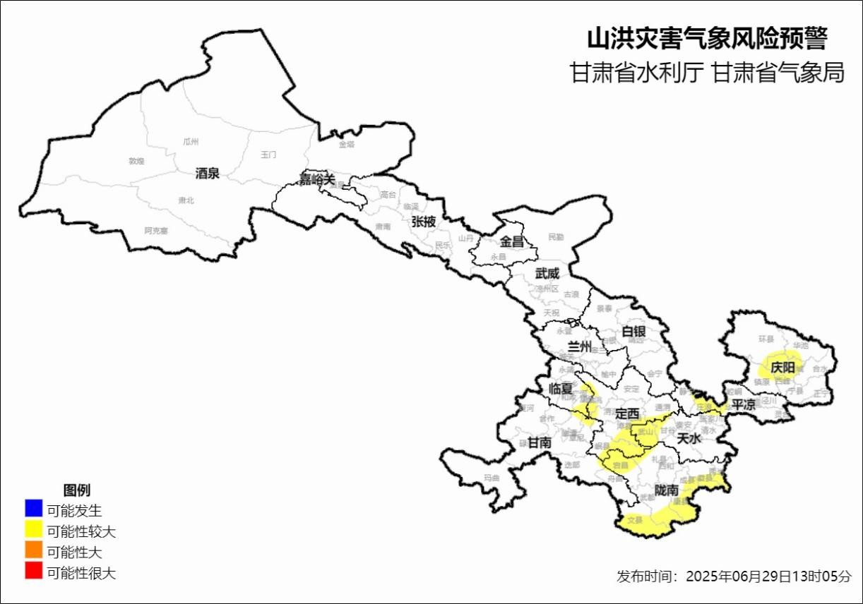 根據(jù)省氣象局《重大氣象信息專報》(2025年甘氣第10期),未來十天甘肅省多降水天氣,具有對流性強、小時雨強大、累積雨量大等特點,洪水災害風險高。6月29日13時,省水利廳、省氣象局聯(lián)合發(fā)布山洪災害氣象風險預警:預計,6月29日14時至30日14時,白銀市(景泰縣),武威市(古浪縣),定西市(臨洮縣、渭源縣、通渭縣、隴西縣、漳縣、岷縣),臨夏州(廣河縣、東鄉(xiāng)縣、康樂縣),甘南州(臨潭縣、卓尼縣、舟曲縣、迭部縣),天水市(秦安縣、甘谷縣、武山縣、張家川縣),隴南市(宕縣、禮縣、武都區(qū)、成縣、文縣、康縣、徽縣、兩當縣),平?jīng)鍪校o寧縣、崆峒區(qū)、華亭市、莊浪縣),慶陽市(西峰區(qū)、慶城縣、環(huán)縣、華池縣、鎮(zhèn)原縣)等地區(qū)發(fā)生山洪災害可能性較大(黃色預警)。