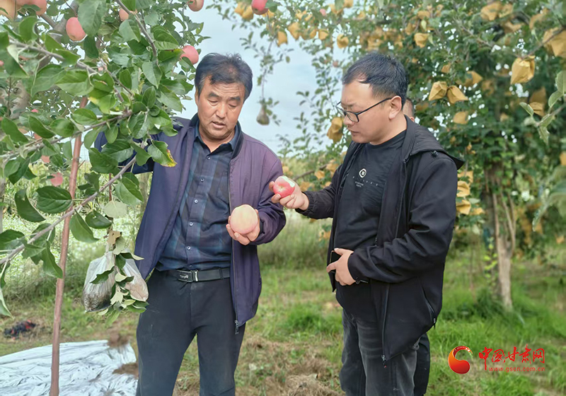 圖為果農(nóng)杜效斌和李建國研究果品 朱強/攝