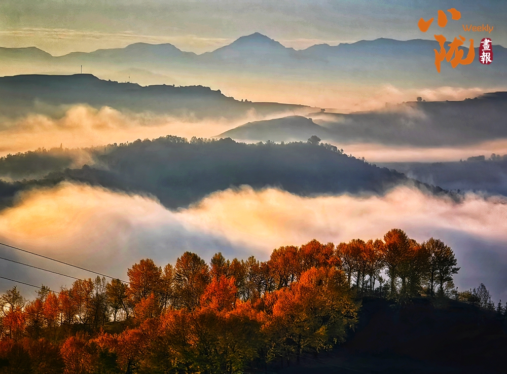 仿佛一夜之間,大北山被染成了暖黃色。極目遠眺,云海漫過蒼翠的山脊,與天邊燃燒的晚霞交融成流動的錦緞,夢幻般的色彩恣意鋪張,金色與藍天、山坳交織在一起,格外溫馨浪漫。