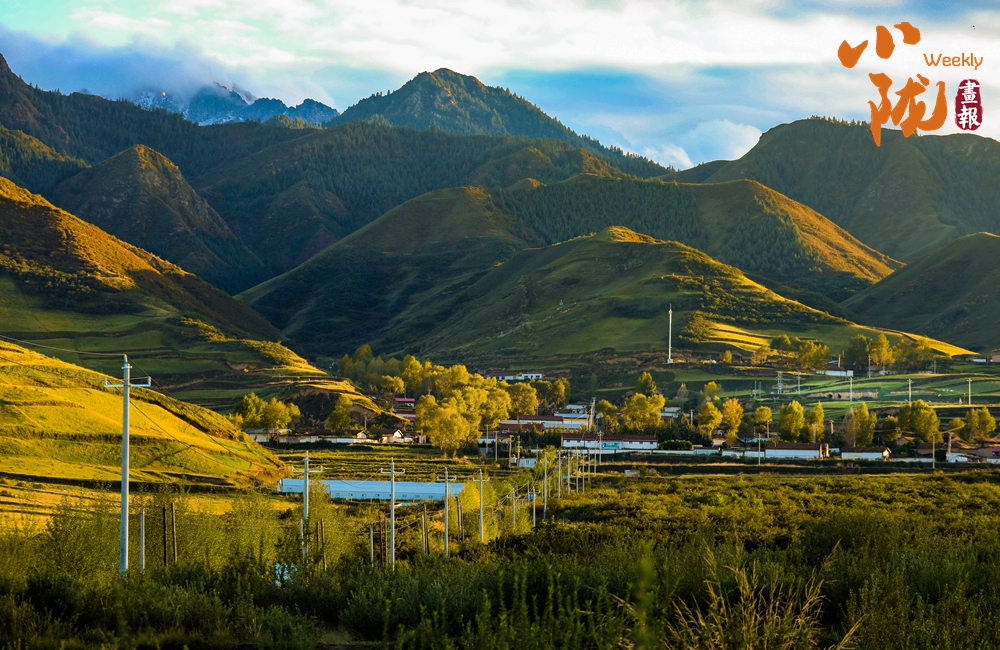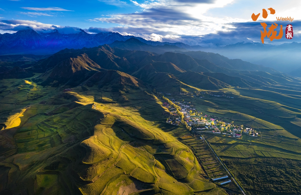 秋風(fēng)溫柔,山川壯美。祁連山腳下,泛黃的草原如同大地鋪開(kāi)的地毯,伸向天際。遠(yuǎn)處的山川,近處的村莊、樹(shù)木沉浸在金色的光芒中,一幅五彩斑斕的秋景圖。