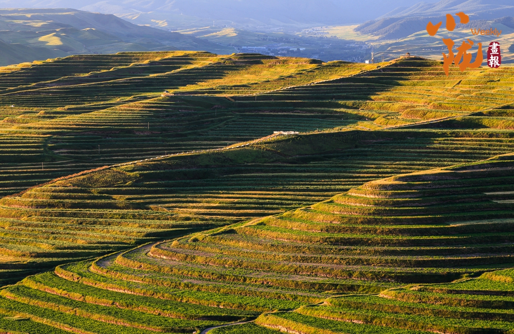 溝壑縱橫,滿目生綠。廣袤的田野在陽(yáng)光下盡情綻放著大自然的絢麗多彩,熱烈地期盼著新季節(jié)的到來(lái);羊群如散落的云朵,在坡地間緩緩移動(dòng),盡享這份寧?kù)o與和諧。