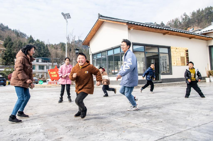 1月24日,在重慶市巫山縣騾坪鎮(zhèn)路口村數(shù)字農(nóng)家書屋外,“臨時(shí)家長(zhǎng)”和孩子們一起玩游戲。