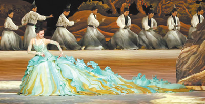 二〇二三年杭州亞運(yùn)會(huì)開幕式“國(guó)風(fēng)雅韻”篇服裝設(shè)計(jì)“水天碧”長(zhǎng)裙,總設(shè)計(jì)師楚艷。