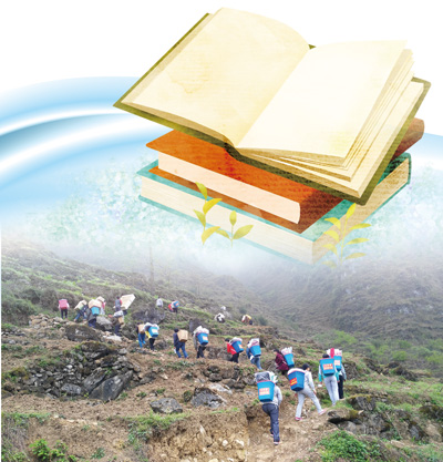 常紹慧和幾個(gè)同事先跑上山去,到村里挨家挨戶(hù)找老鄉(xiāng)借背簍,另一撥同事則在山腳下整理書(shū)籍。不一會(huì),大家把書(shū)和禮物分裝進(jìn)借到的幾個(gè)背簍里,每人背著一個(gè)背簍上山。