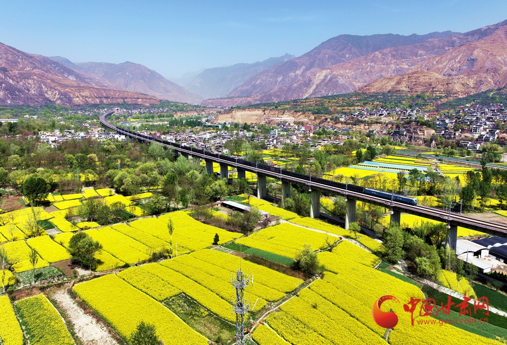 4月10日,列車在蘭渝鐵路宕昌縣沙灣鎮(zhèn)段附近行駛,穿行于花海之間?,F(xiàn)代交通動脈與原始鄉(xiāng)野在此默契共生,火車轟隆駛過,為春日畫卷增添了別樣的景致。