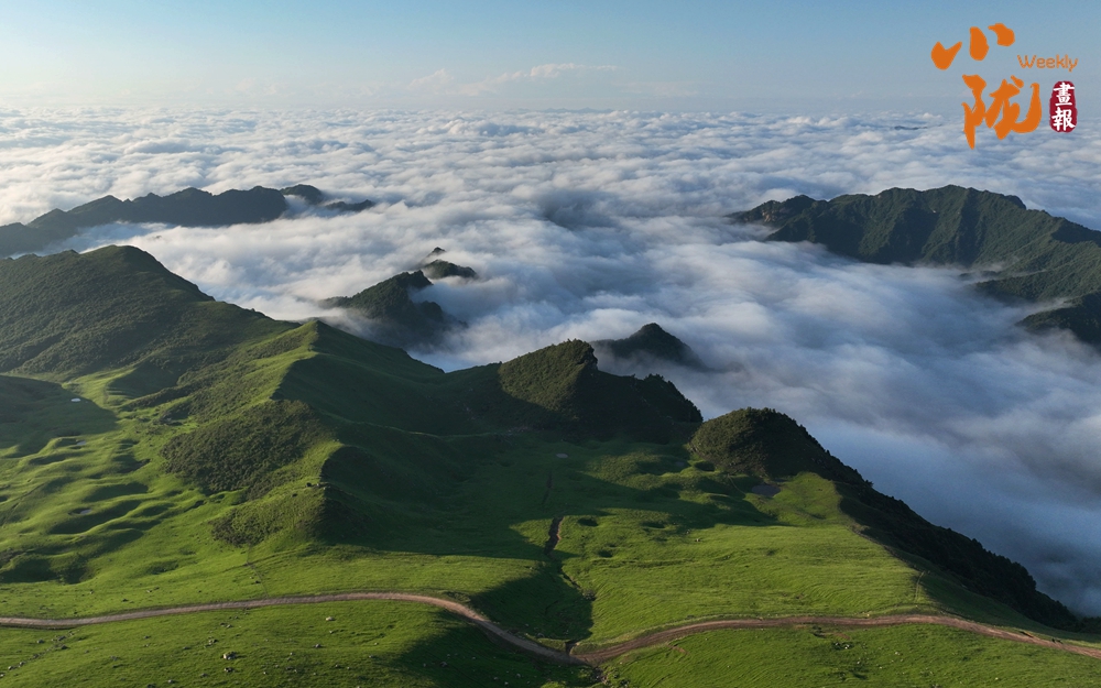 登頂望遠,千壩草原高山、草甸、草原相互交織,牛馬、羊群像一顆顆散落的珍珠點綴其中。茫茫云海鋪滿整個天際,翻涌的流云大河奔騰,蔚為壯觀,如臨于大海之濱。