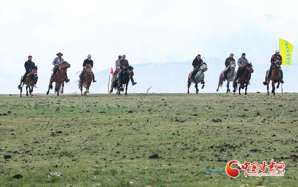 6月21日,甘肅省張掖市肅南裕固族自治縣康樂(lè)草原上,騎手們策馬揚(yáng)鞭,裕固大營(yíng)賽馬場(chǎng)展開(kāi)了一場(chǎng)民族賽馬的激烈角逐,引得游客們陣陣喝彩。