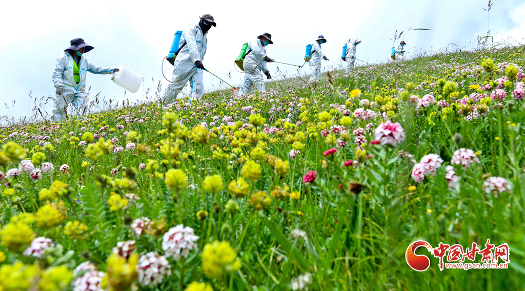 盛夏時節(jié),位于張掖市肅南裕固族自治縣的皇城夏日塔拉草原、康樂賽汗塔拉草原,宛如一塊巨大的綠色絨毯鋪向天際,滿目翠綠,令人心醉神迷。然而,此時也正是草原上狼毒花毒害草盛放、蝗蟲繁殖的高峰期。連日來,肅南縣林草專業(yè)技術(shù)人員帶領(lǐng)2000多牧民,抓住毒害草開花、蝗蟲繁殖最快,也是清除滅殺的最佳時機,在“三北”工程六期160多萬畝廣袤的草原上,打響了以“蟲害防治+害草治理+噴施葉面+播撒草籽的”為核心的“三北”工程林草濕荒一體化保護修復(fù)攻堅戰(zhàn)。