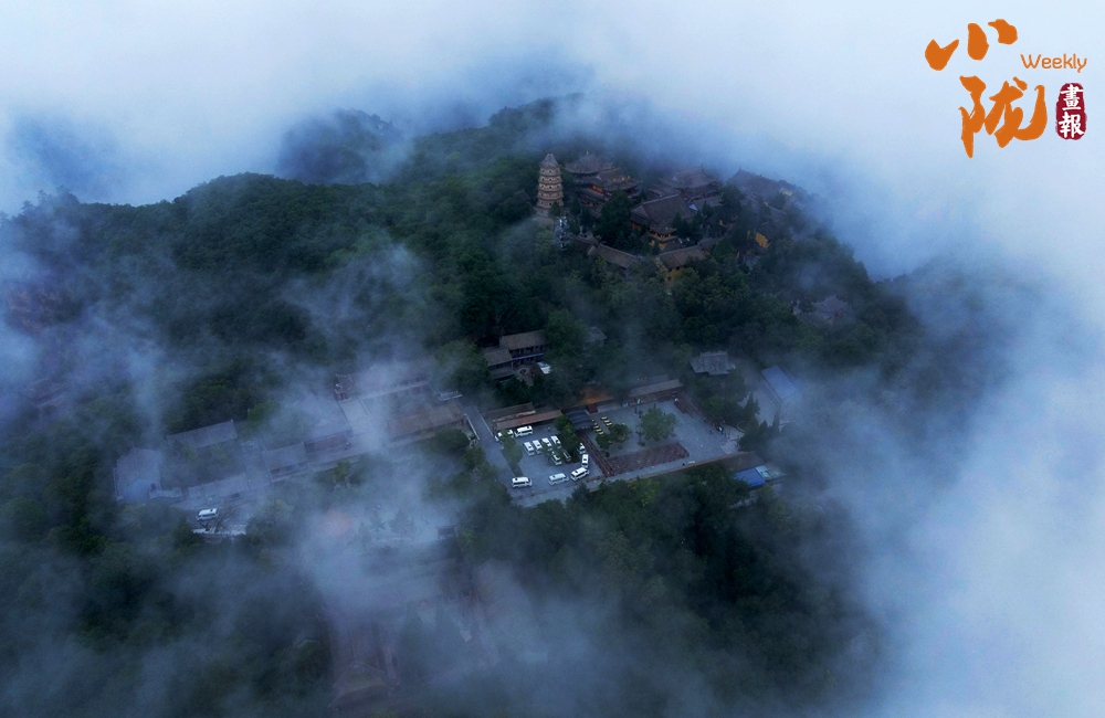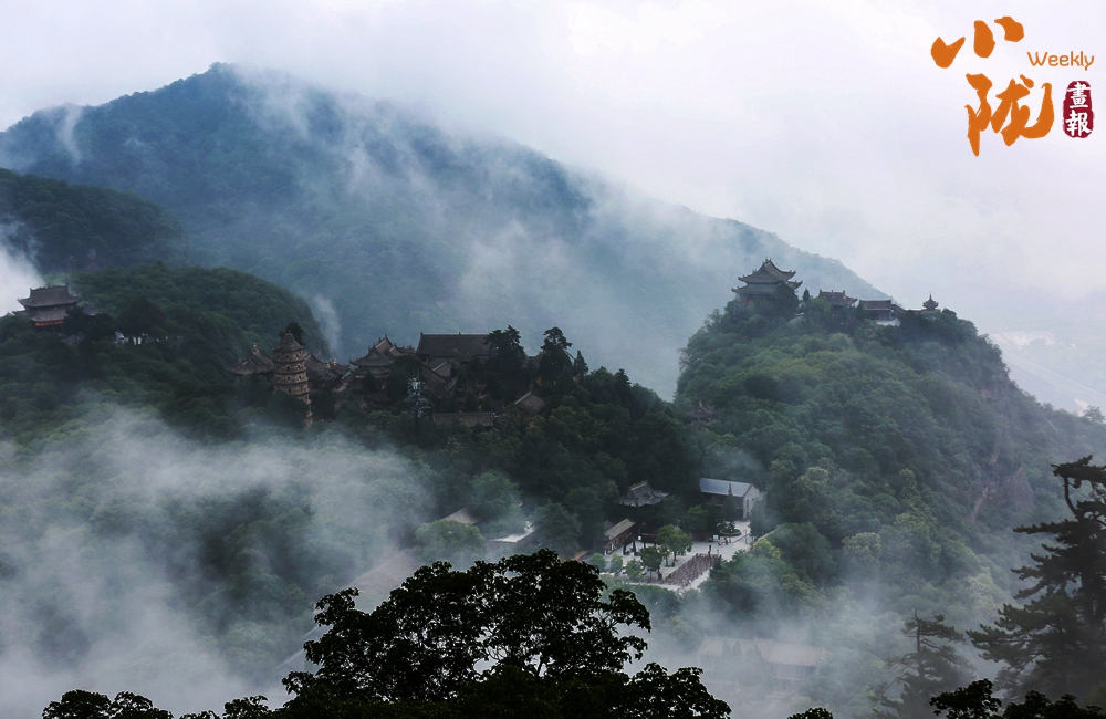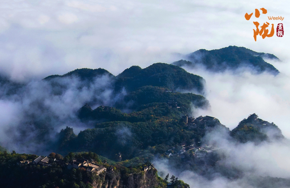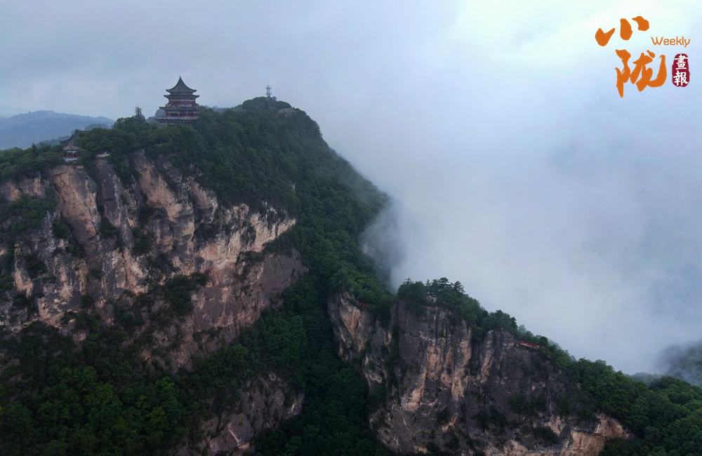 云霧繚繞,山水與寺廟隱現(xiàn),營(yíng)造出神秘且令人向往的視覺效果。站在半山腰,背靠懸崖,深邃不可見底,不禁生出“山登絕頂我為峰”的豪情。然而,世間萬(wàn)物,瞬息萬(wàn)變,是否成為峰巔之巔又何妨?