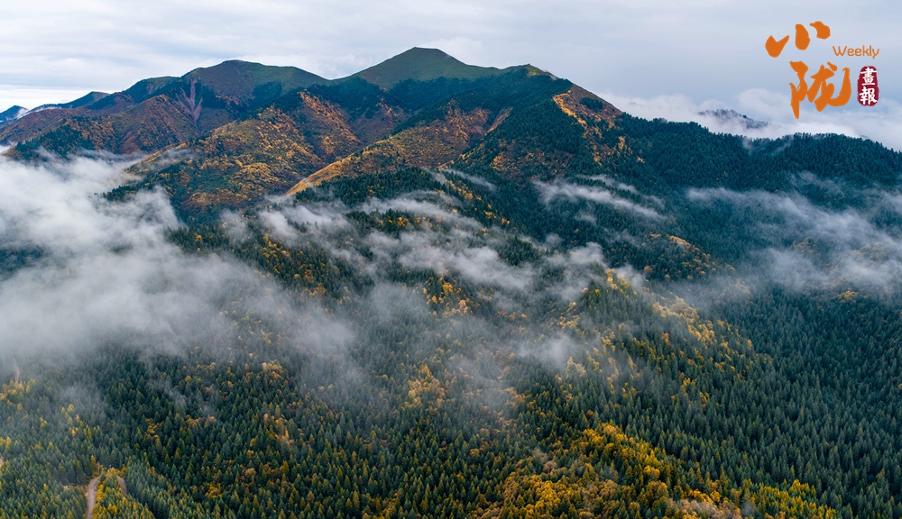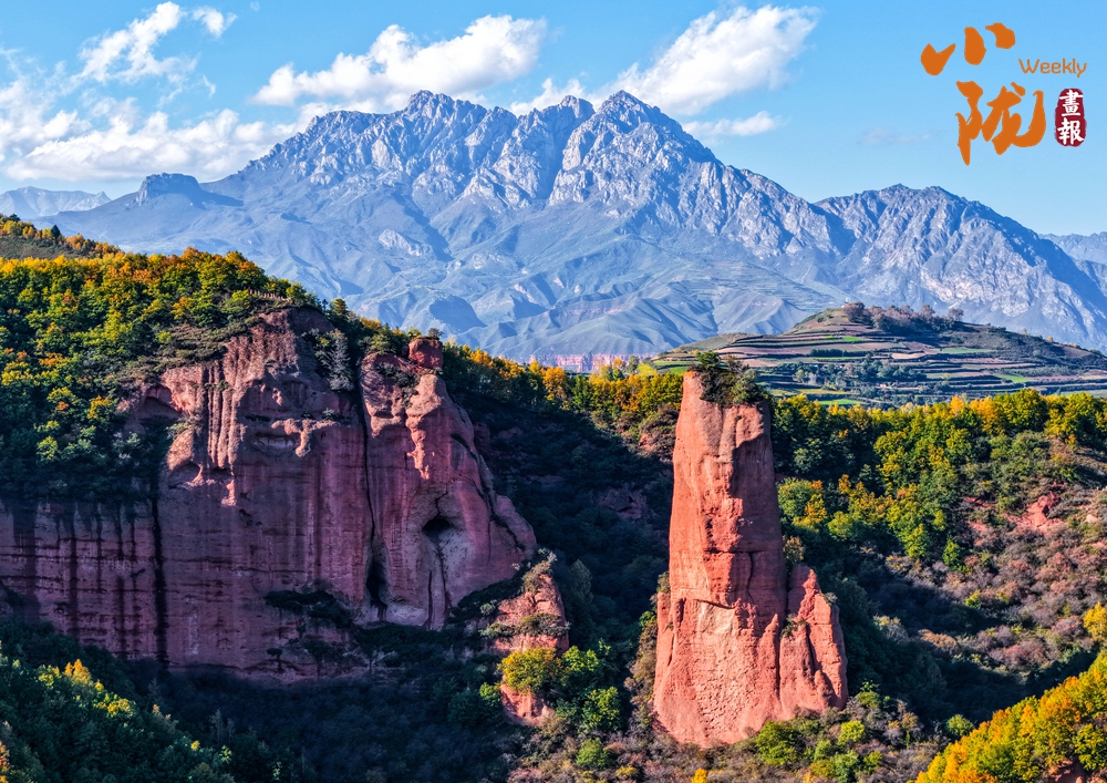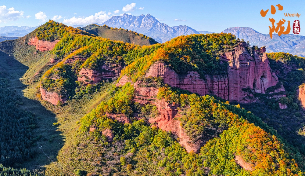 俯瞰整個(gè)冶力關(guān),遠(yuǎn)處的雪峰在陽(yáng)光照耀下泛著銀光,與近處的彩林形成鮮明對(duì)比,宛如一幅氣勢(shì)磅礴的山水畫卷。