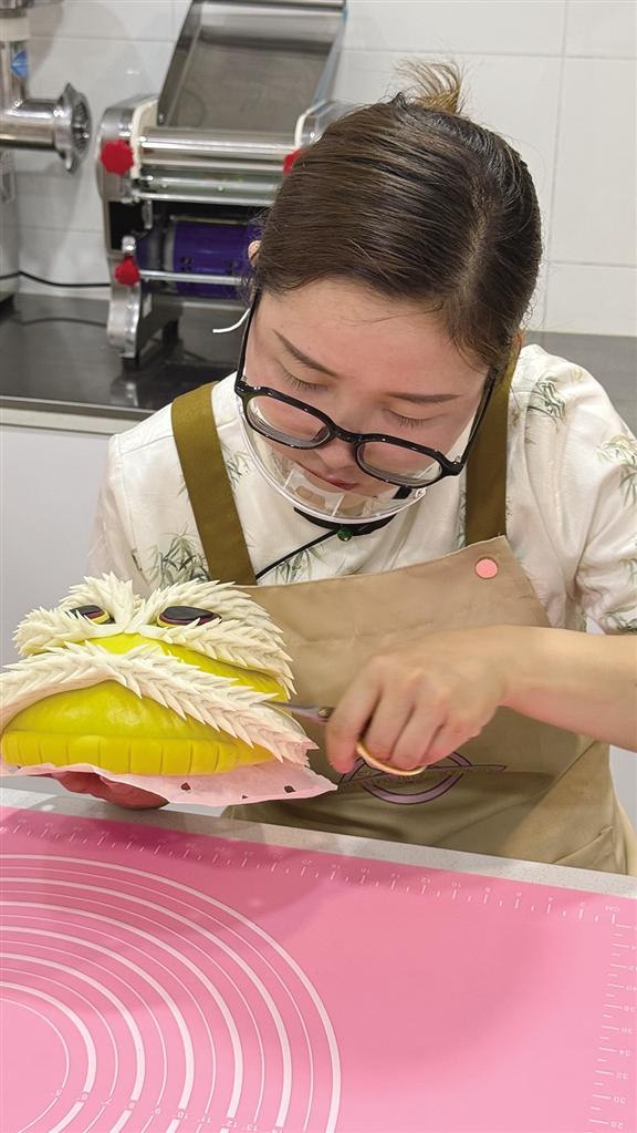 走進(jìn)楊曉蘭的花饃小店,濃郁面香裹挾著藝術(shù)氣息撲面而來(lái)。展架上,威風(fēng)凜凜的醒獅昂首欲嘯,憨態(tài)可掬的卡通角色惹人喜愛(ài),盤踞的靈蛇栩栩如生……此刻,她正凝神制作醒獅花饃,搓、捏、塑形,面團(tuán)在她指尖迅速呈現(xiàn)出獅頭的威武雛形。